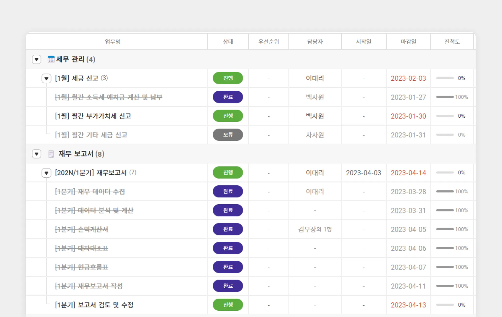 회계팀에서 진행하고 있는 업무를 서로 확인할 수 있어, 업무 분배 및 리소스 배분도 쉽게 할 수 있습니다.