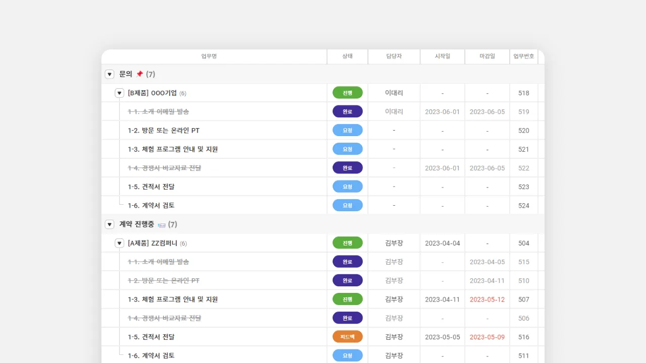 영업팀 각 담당자가 관리하고 있는 기업들의 전체 현황을 한눈에 파악할 수 있으며, 기업별 진행 단계를 확인할 수 있어 기업에 맞는 영업 활동이 가능합니다.