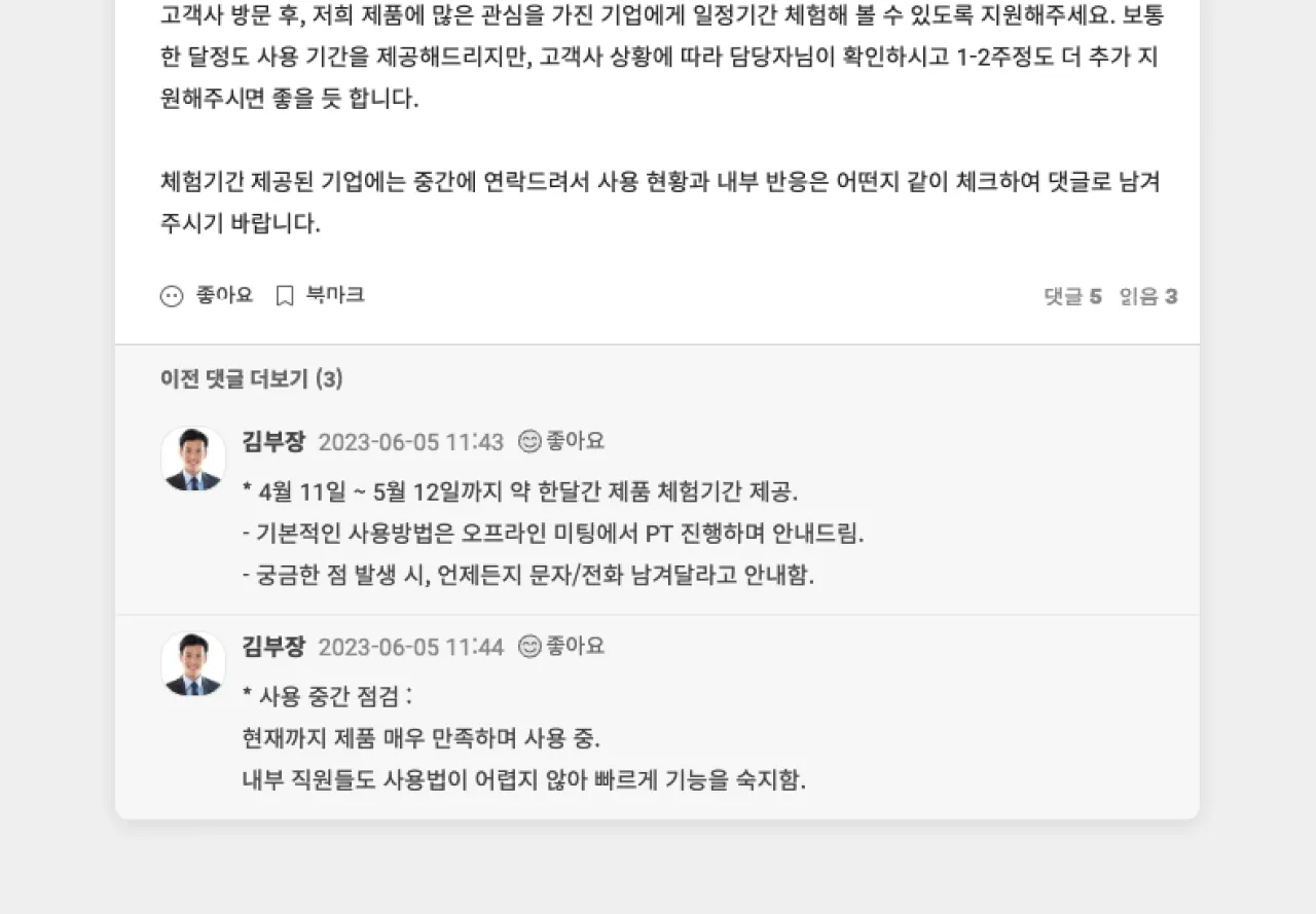 각 고객사의 공통된 정보와 영업활동으로 업데이트된 히스토리를 댓글로 공유할 수 있으며, 기업의 영업 진행 현황을 한눈에 파악할 수 있습니다.