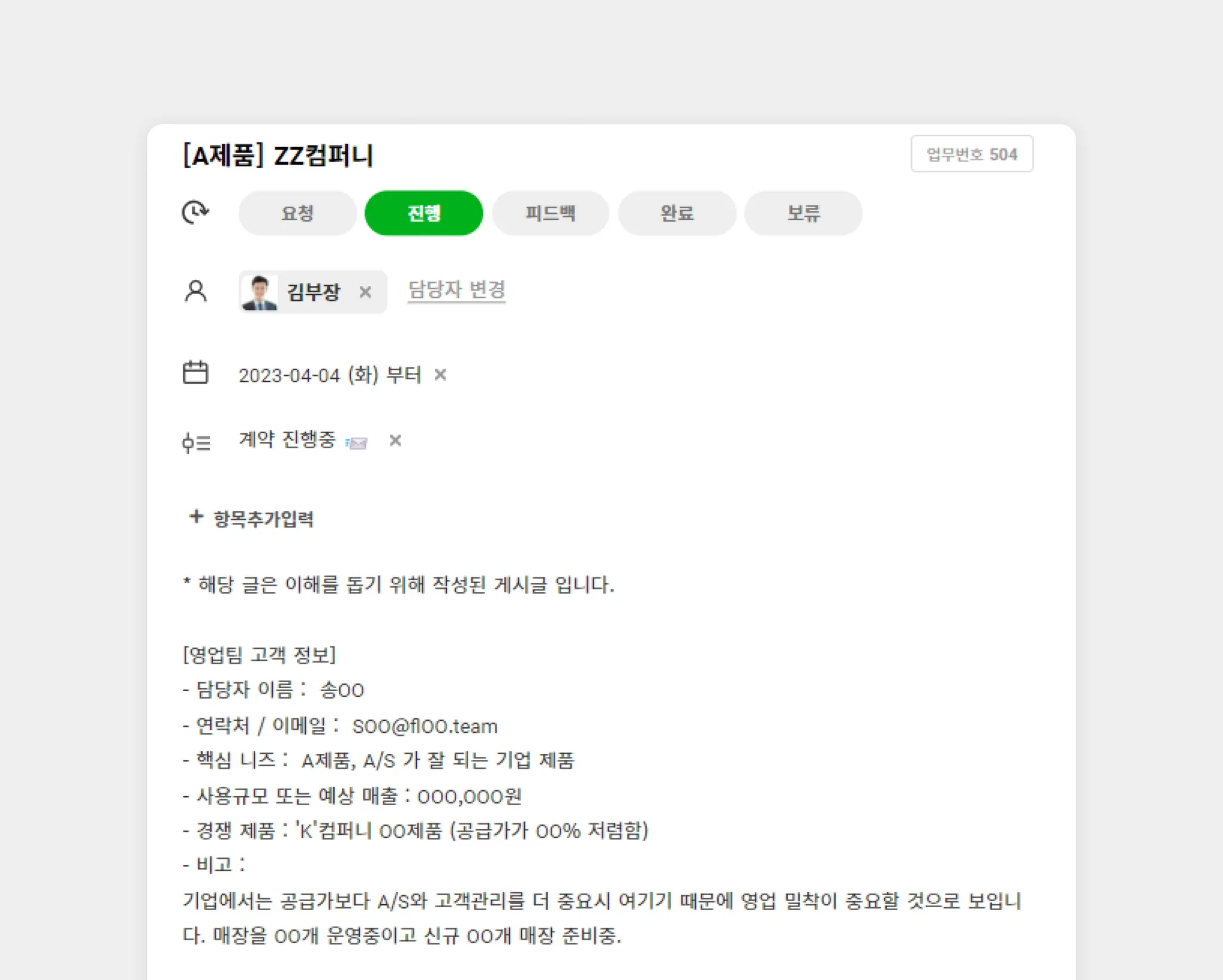 게시글 본문에 기업 정보를 기재하여 고객사 소통에 필요한 정보를 빠르게 확인하고 응대할 수 있습니다.