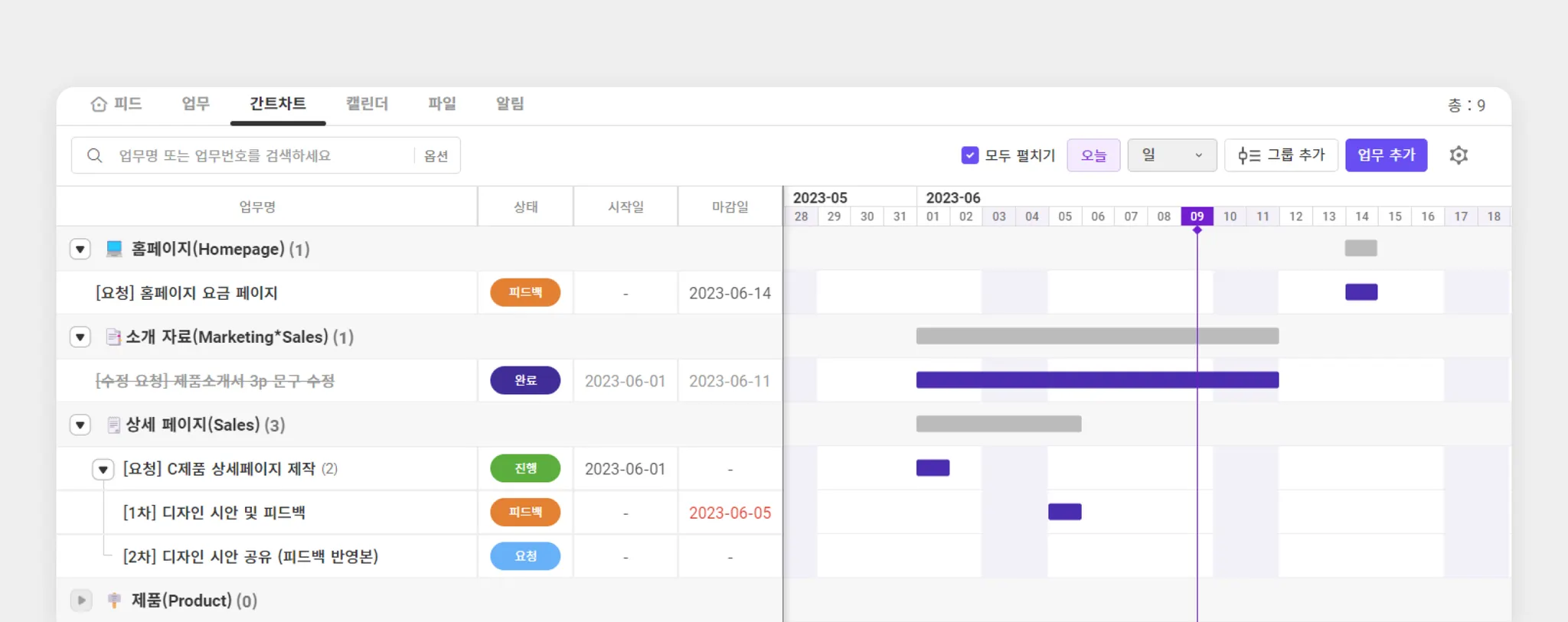 ‘간트차트’를 통해 디자인팀의 업무 일정과 각 담당자의 진행 업무를 파악할 수 있습니다.