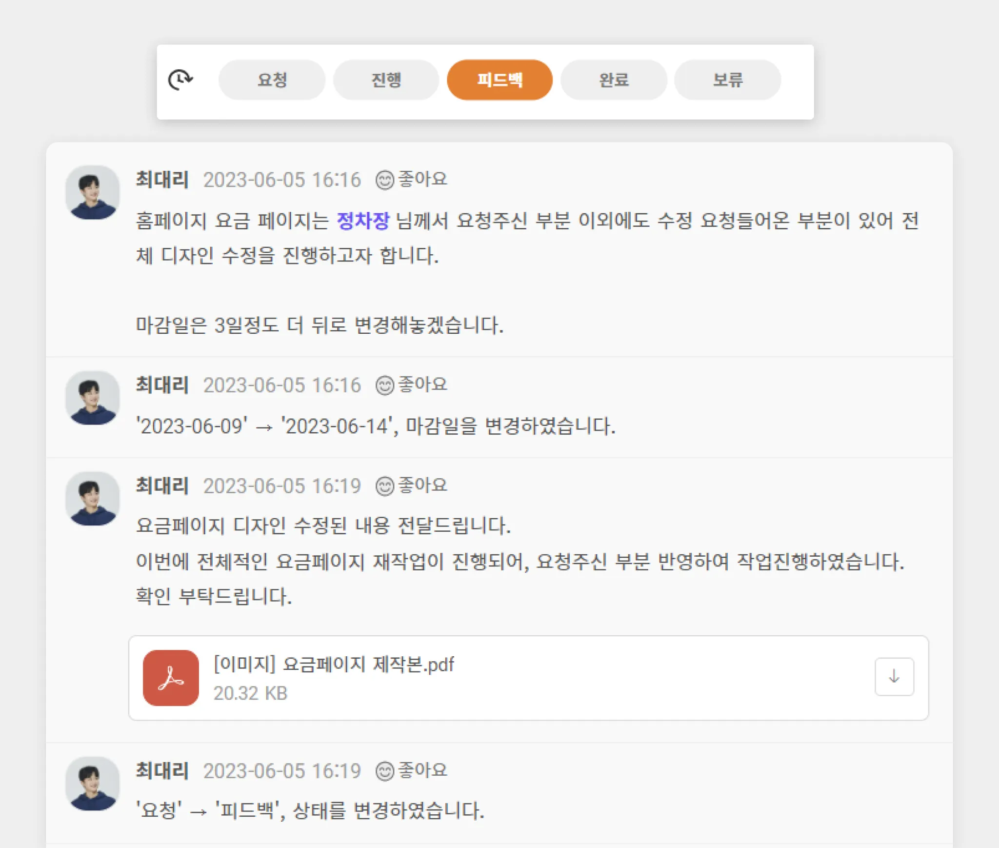 업무에 대한 진행 과정이 댓글로 기록되어 있어 담당자에게 묻지 않아도 업무 처리 과정을 확인할 수 있습니다.