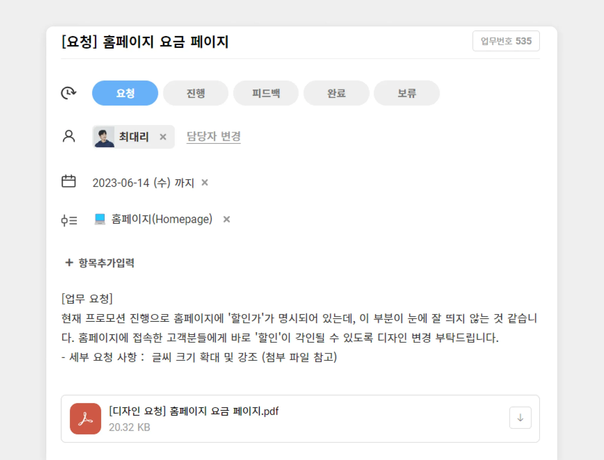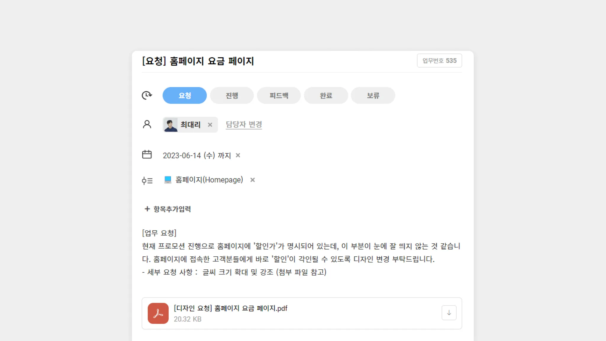 디자인팀에 디자인 작업을 요청하는 프로젝트 공간입니다. 요청 사항을 텍스트로 전달하고, 관련 자료를 함께 첨부할 수 있어 잘못된 커뮤니케이션을 방지합니다.